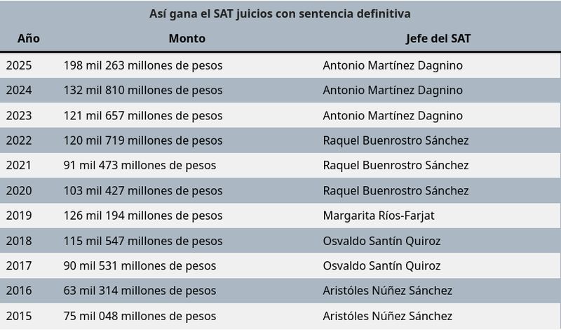 De enero a diciembre de 2025, los abogados del SAT ganaron juicios con sentencias definitivas por 198 mil 263 millones de pesos comparados con los 132 mil 810 millones de pesos del 2024, el último año de Andrés Manuel López Obrador.