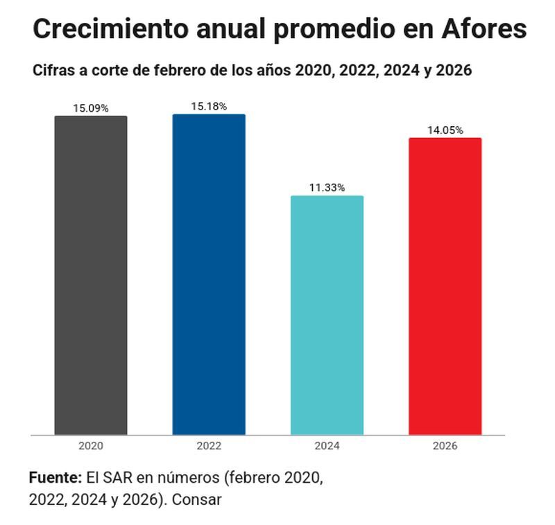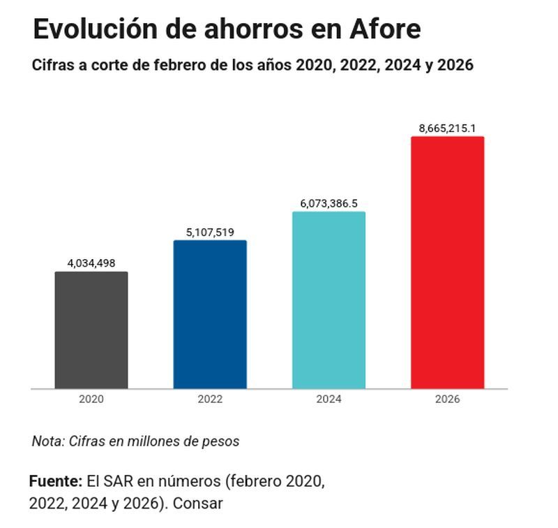 La inversión de las afores se ha mantenido, en gran parte, en los mismos sectores, solo incrementando el volumen de recursos. En una revisión de las estadísticas de la Consar, entre 2020 y 2026, los ahorros se han duplicado, pasando de 4,034,498 millones a 8,665,215.1 millones de pesos.