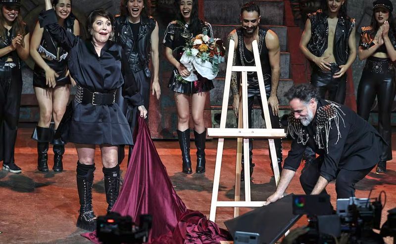 La cantante Alejandra Guzmán celebró el primer año de temporada del musical «Malinche» con tal fuerza, que terminó rompiendo la placa conmemorativa ante el asombro de Nacho Cano, creador y director de este montaje.
