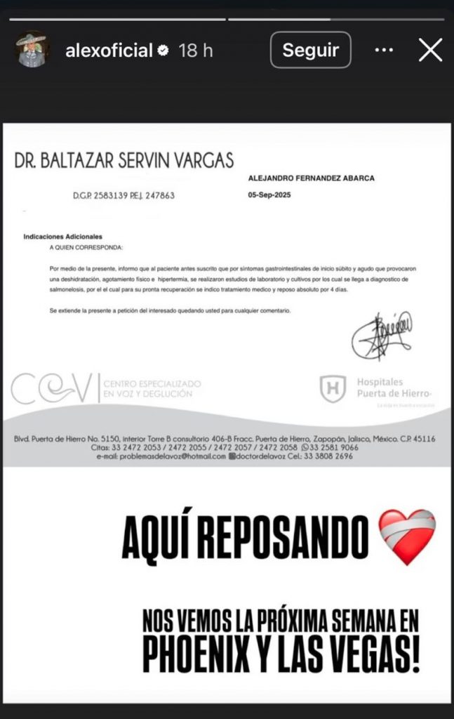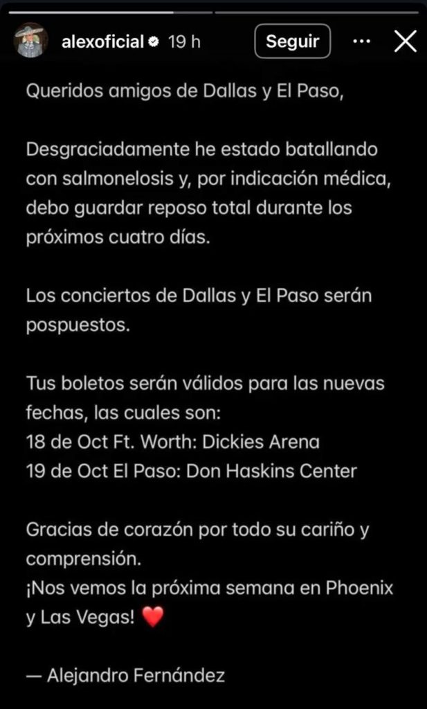 Durante las últimas horas, el nombre de Alejandro Fernández despertó las alarmas de sus seguidores tras suspender dos conciertos en Estados Unidos luego de recibir un diagnóstico de salmonelosis. Por recomendación médica, el cantante pospuso sus presentaciones en Dallas y El Paso Texas.