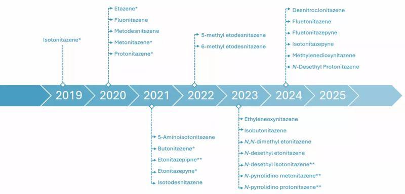 En febrero de 2025, se halló evidencia de la aparición de nitazenos a escala mundial. “En este momento, hay señales fuertes para una nueva propagación de este grupo de opioides sintéticos“, según la Oficina de Naciones Unidas contra la Droga y el Delito (UNODC).
