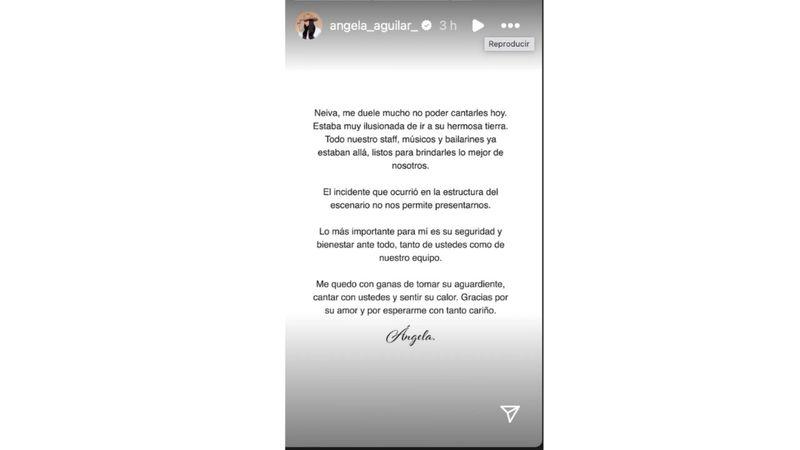 En una historia publicada en su cuenta de Instagram, Ángela Aguilar explicó las razones de la cancelación:
