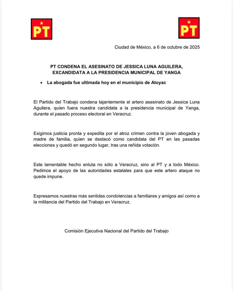 De igual manera, el PT calificó los hechos como un “artero asesinato” y exigió justicia pronta y expedita para quien fuera su candidata en el proceso electoral en Veracruz a través de un mensaje compartido poco después de las 6:00 de la tarde.