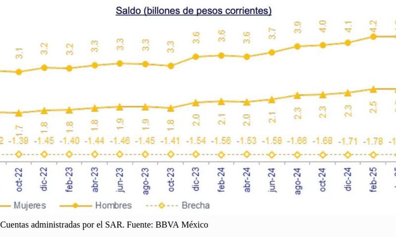 La brecha en los saldos de las cuentas administradas por el SAR ha mostrado una tendencia al alza, al pasar de 1.42 billones de pesos en agosto de 2022 a 1.78 billones en abril, en ambos casos a favor de los hombres.
