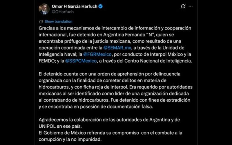 “El detenido cuenta con una orden de aprehensión por delincuencia organizada con la finalidad de cometer delitos en materia de hidrocarburos, y con ficha roja de Interpol. Era requerido por autoridades mexicanas al ser identificado como líder de una organización dedicada al contrabando de hidrocarburos“, publicó García Harfuch en su cuenta oficial de X.