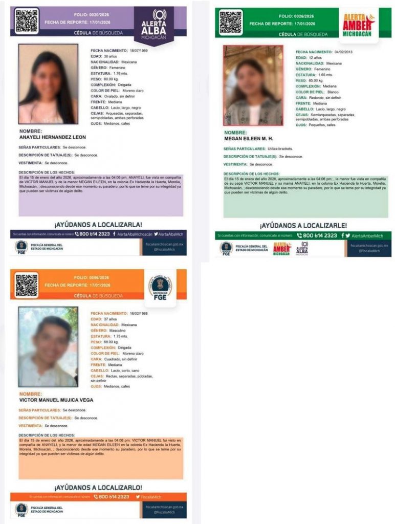 Se trata de Víctor Manuel Mujica Vega, de 37 años; Megan Eileen M.H., de 12 años; y Anayeli Hernández León, 36 años.