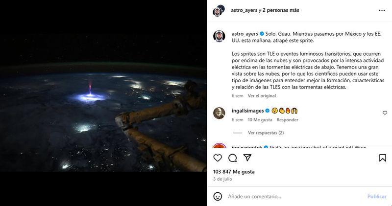 El pasado 3 de julio, Ayers publicó en Instagram el fenómeno como un ‘sprite‘, sin embargo, la NASA aclaró de qué se trató realmente.
