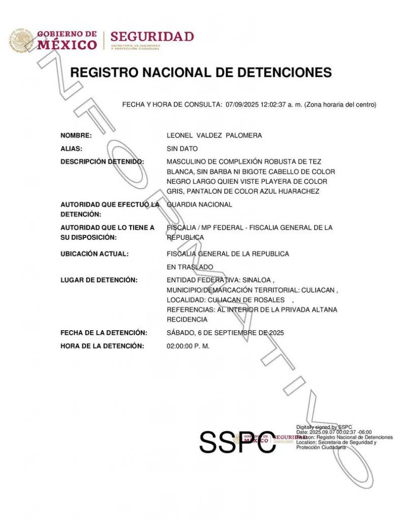 Según un documento del Registro Nacional de Detenciones, Valdez Palomera fue capturado a las 14:00 horas en el interior de la privada en mención; es descrito como un hombre de complexión robusta y tez blanca, sin barba ni bigote, cabello largo de color negro, quien vestía una playera gris, un pantalón de color azul y huaraches.