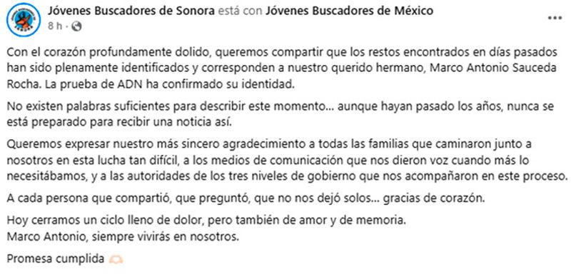 “Con el corazón profundamente dolido, queremos compartir que los restos encontrados en días pasados han sido plenamente identificados y corresponden a nuestro querido hermano, Marco Antonio Sauceda Rocha. La prueba de ADN ha confirmado su identidad”, dice el mensaje.