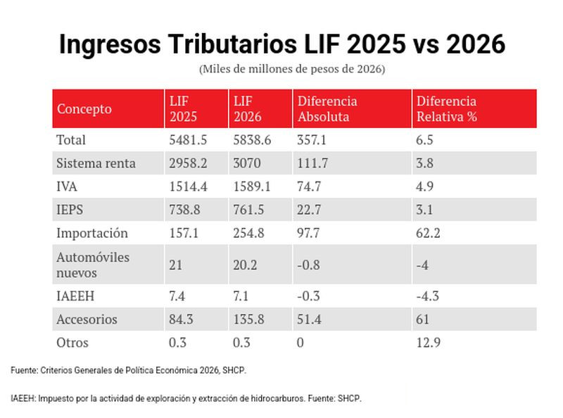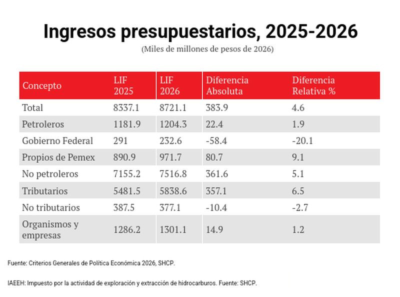 Los ingresos no petroleros aumentarán 4.4%, impulsados por un avance de 5.7% en los tributarios, mientras que los no tributarios se reducirán 6.8%, debido a que en 2026 ya no se repetirán los aprovechamientos extraordinarios de este año.