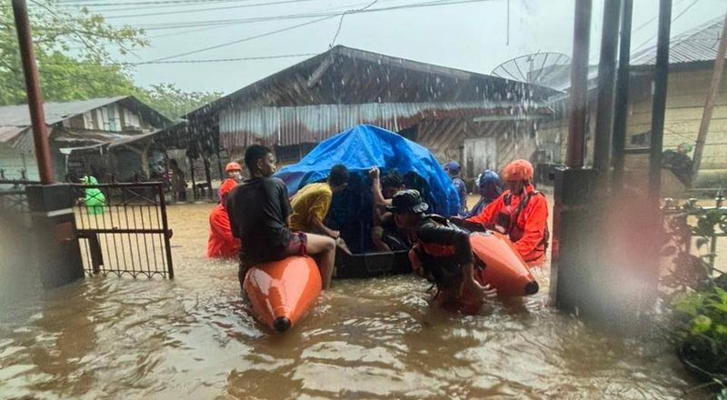 Rescatistas sacan incluso en brazos a personas del interior de viviendas anegadas a las que llegan a remo sobre lanchas neumáticas en medio del intenso temporal, reflejan vídeos facilitados por la BNPB.
