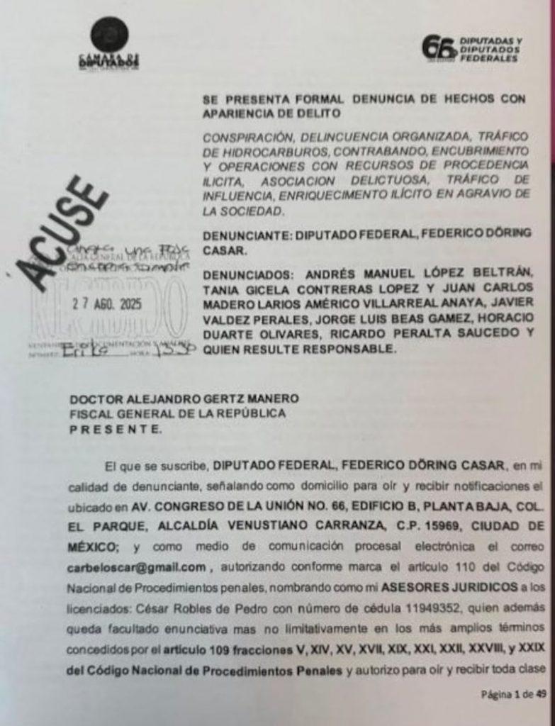 En conferencia de prensa, el legislador dio a conocer que el 27 de agosto, Döring formalizó la denuncia, en la que se mencionan presuntos delitos como conspiración, delincuencia organizada, tráfico de hidrocarburos, contrabando, encubrimiento, operaciones con recursos de procedencia ilícita, asociación delictuosa, tráfico de influencia y enriquecimiento ilícito a costa de la sociedad. Entre los hechos expuestos, destaca la imputación de operaciones con recursos de procedencia ilícita y la presunta existencia de una red criminal con impacto nacional.