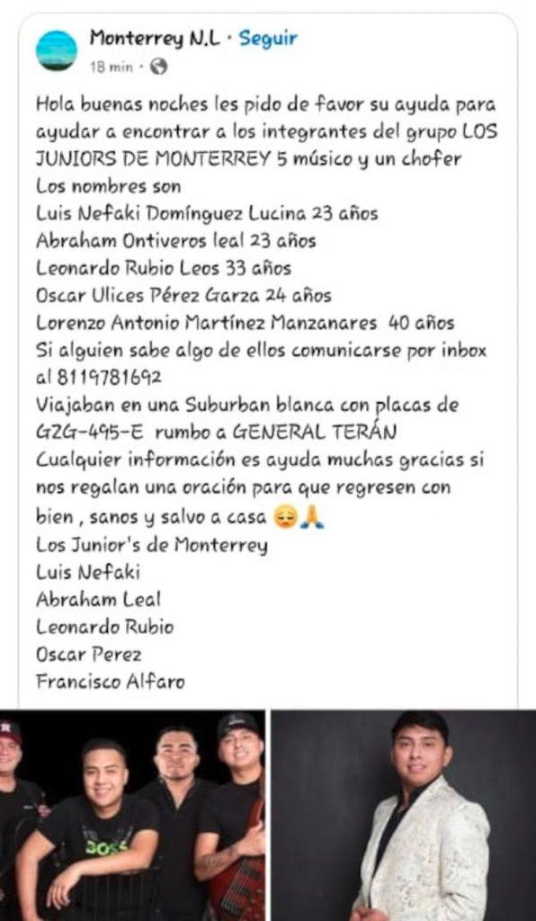 Integrantes del grupo musical los Junior’s de Monterrey desaparecieron luego de que este fin de semana acudieron a un evento para el que fueron contratados en el municipio de General Terán, informaron familiares de los músicos.