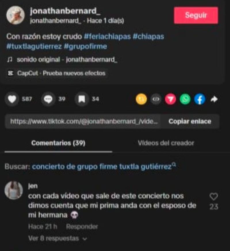 “Con cada video que sale de este concierto nos dimos cuenta de que mi prima anda con el esposo de mi hermana”, escribió la mujer en cuestión en una publicación del usuario de Instagram Jonathan Bernard.