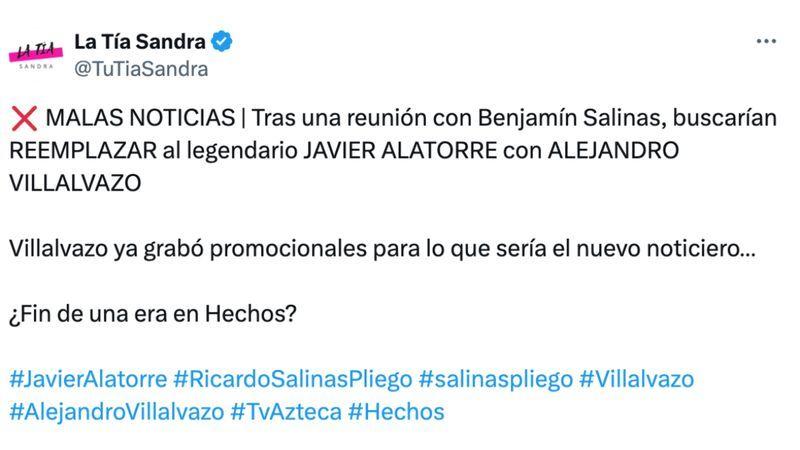 “Buscarían REEMPLAZAR al legendario JAVIER ALATORRE con ALEJANDRO VILLALVAZO. Villalvazo ya grabó promocionales para lo que sería el nuevo noticiero…”, se lee en la publicación.