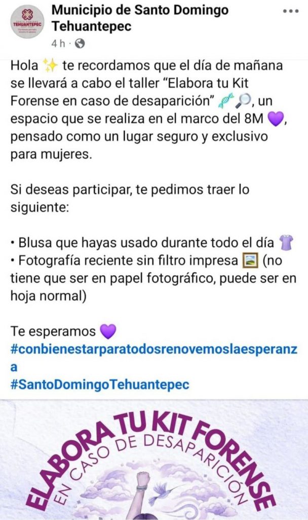 La alcaldesa del municipio oaxaqueño de Santo Domingo Tehuantepec, Ana Cecilia Pérez Velásquez, anunció la separación inmediata de la titular de la Instancia Municipal de la Juventud, la médico Keyla Karlet Calvo Vásquez, tras la difusión de un taller para elaborar un ‘Kit forense en caso de desaparición’, que levantó la indignación de colectivas, activistas y organizaciones civiles.