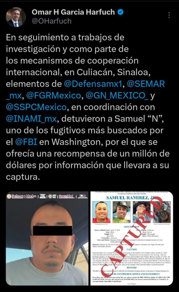 El secretario de Seguridad y Protección Ciudadana (SSPC), Omar García Harfuch, informó a través de su cuenta en X que el FBI ofrecía una recompensa de un millón de dólares por la detención de Ramírez Jr, de 34 años de edad.