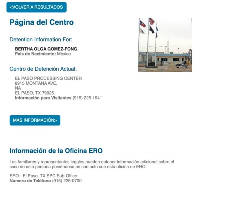 Tras su captura, Gómez Fong fue internada en El Paso Processing Center, de acuerdo con la ficha de detención emitida por el Sistema de Localización de Detenidos en Línea del ICE.