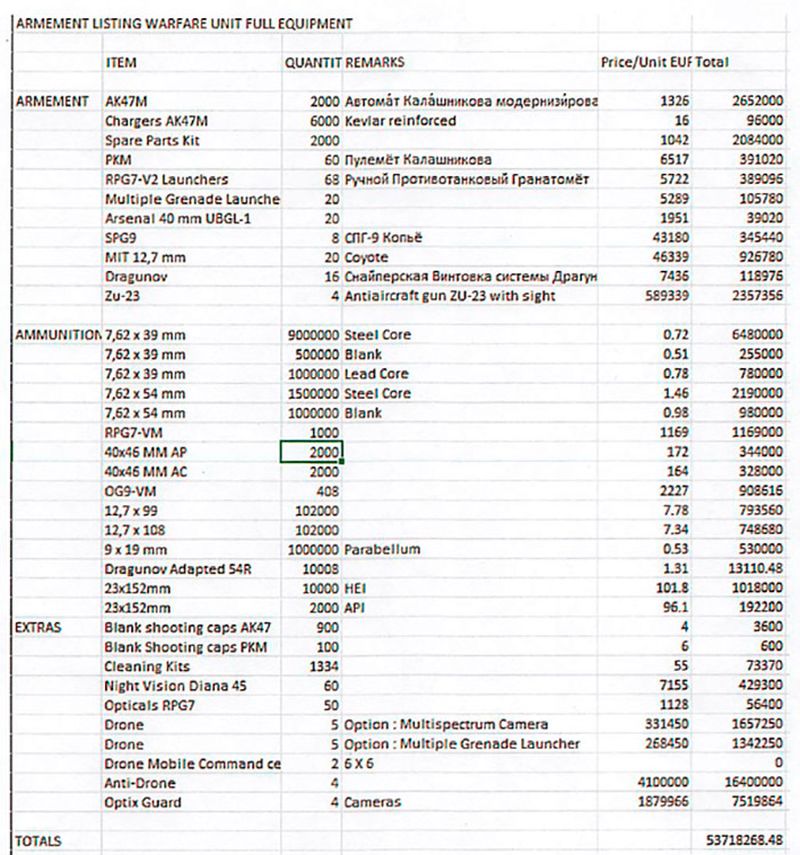 Mirchev habría elaborado una lista de armas con un valor aproximado de 53.7 millones de euros (unos 58 millones de dólares), mientras que Asumo y Mwapinga acordaron proporcionar documentación para ocultar el verdadero destino del arsenal.