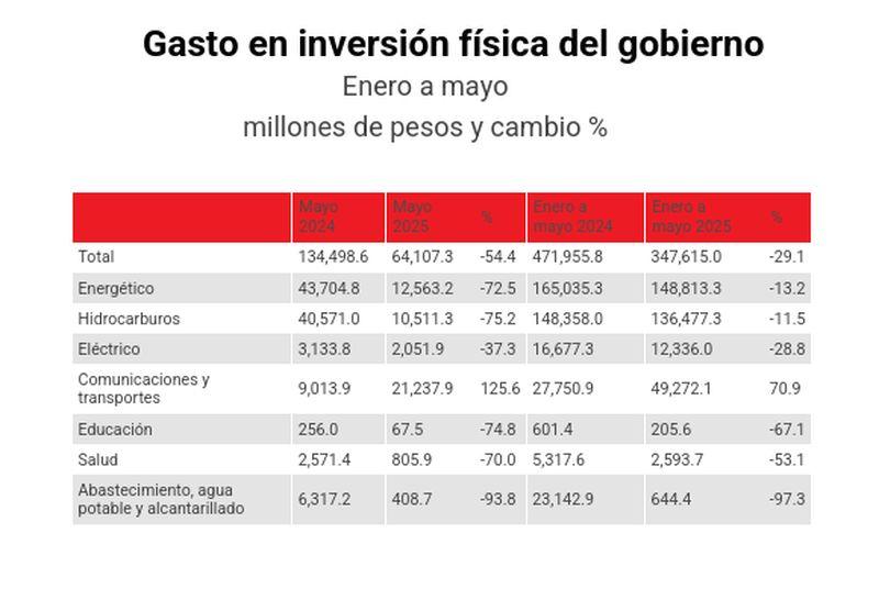 La inversión pública cayó 29.1% entre enero y mayo de 2025, la mayor contracción desde 1995, año recordado por la crisis económica que desencadenó el efecto tequila.