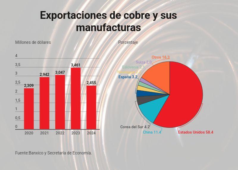 Según datos de Banxico, las exportaciones mexicanas de cobre y sus manufacturas alcanzaron 2,455 millones de dólares en 2024.