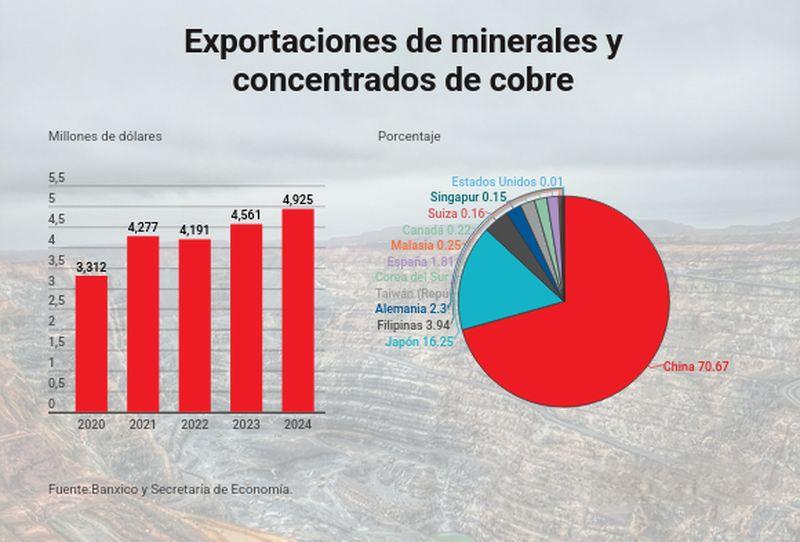 China es el mayor comprador. En 2024 absorbió más de 2,300 millones de dólares en minerales y concentrados mexicanos. La diferencia es abismal. Estados Unidos importa cobre, sí. Pero México no es su fuente principal.