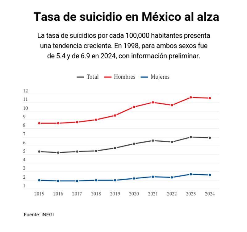 La información preliminar de 2024 eleva la tasa a 6.9, frente al 5.4 de 1998, lo que confirma un aumento sostenido. La sobremortalidad masculina es evidente, ya que ocurren más de cuatro suicidios de hombres por cada uno de mujeres, con una tasa de 11.5 por cada 100,000 hombres, frente a 2.6 en mujeres, explicó Álvaro Carrera, jefe del departamento de Comunicación Regional del Inegi.