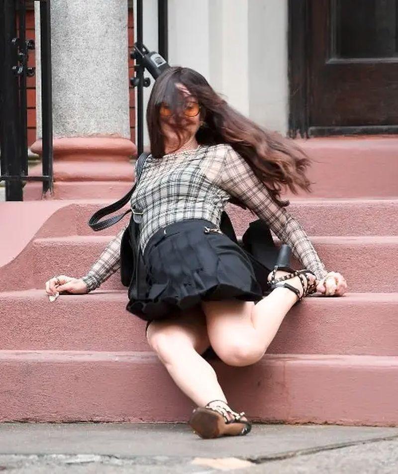 La actriz fue captada mientras tropezaba bajando unas escaleras en Nueva York, donde se encontraba grabando una de las escenas de la esperada secuela.