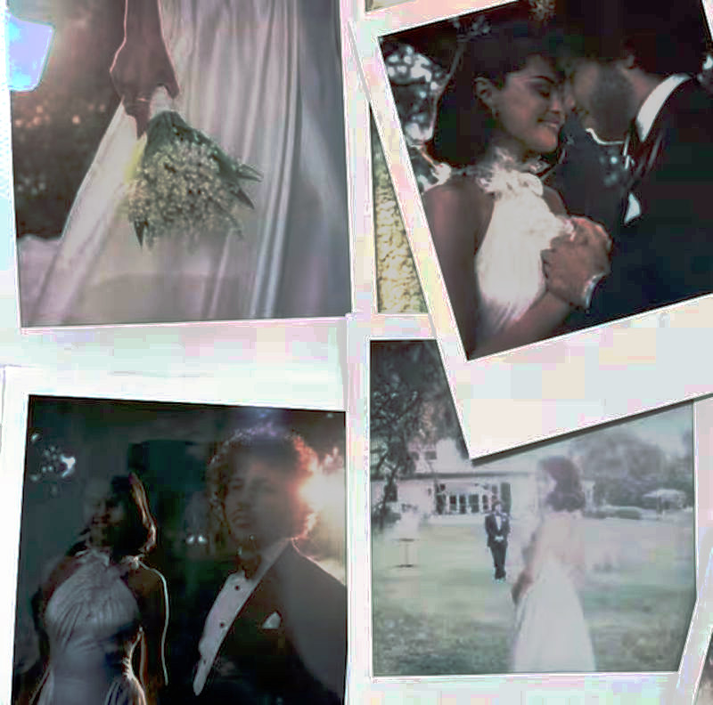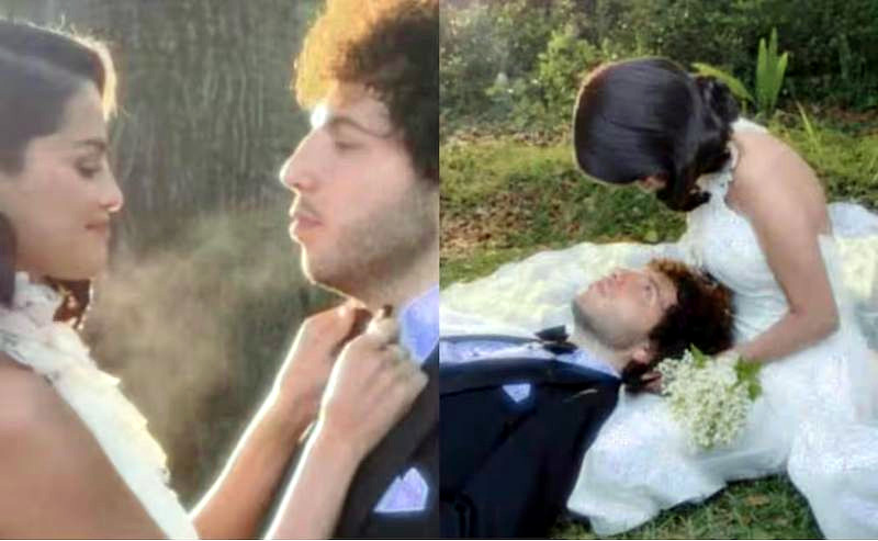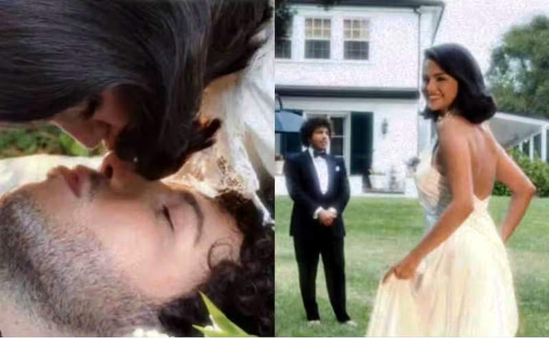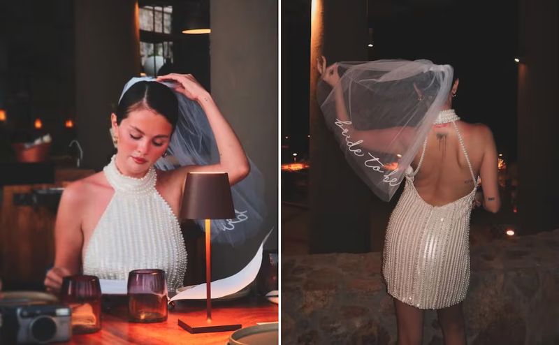 Las imágenes destacan algunos detalles de su vestuario: el vestido ceñido de Selena con pliegues en el pecho y flores tridimensionales, sus anillos de compromiso, y el clásico smoking negro de Blanco, cuyo moño Selena finge ajustar en las postales.