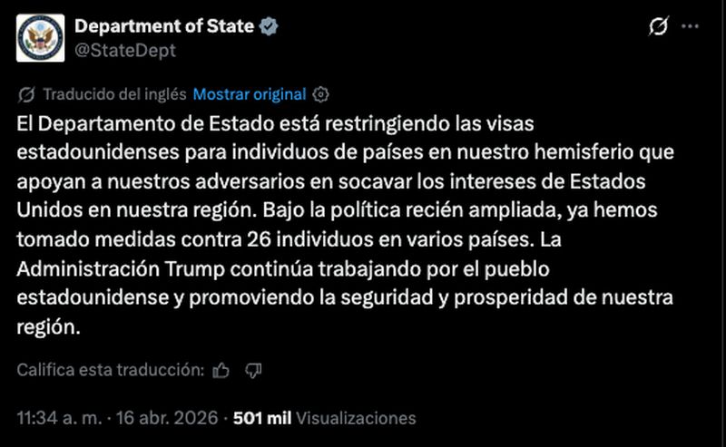 Estados Unidos quita visas a quienes apoyan a sus ‘adversarios’: van 26 en América