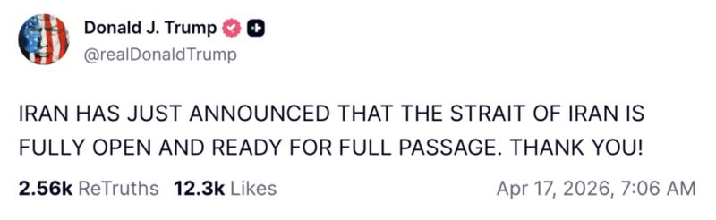 Estrecho de Ormuz está ‘completamente’ abierto, anuncian Trump e Irán