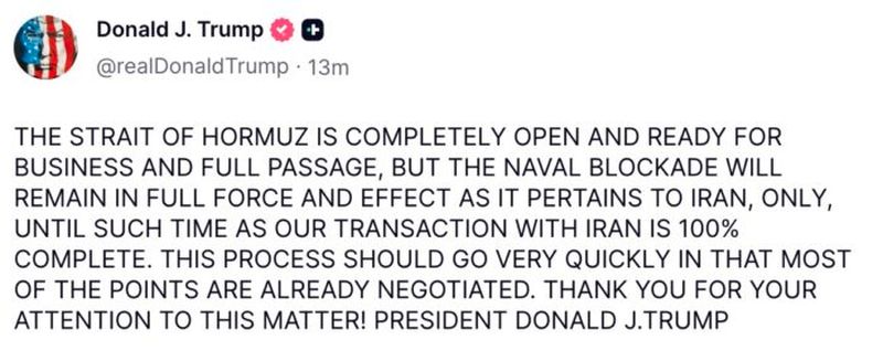 Pese al anunció, más tarde, el republicano aclaró que el bloqueo naval se mantendrá en “pleno vigor y efecto, únicamente en lo que respecta a Irán, hasta que nuestra transacción con Irán se haya completado al 100%”.