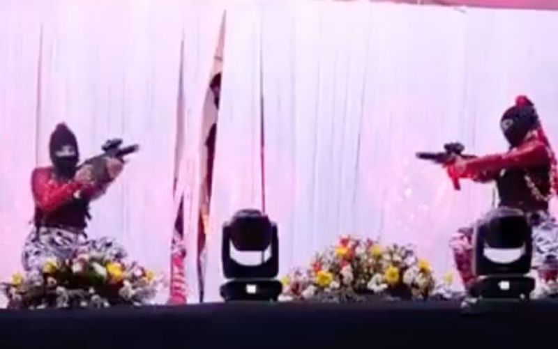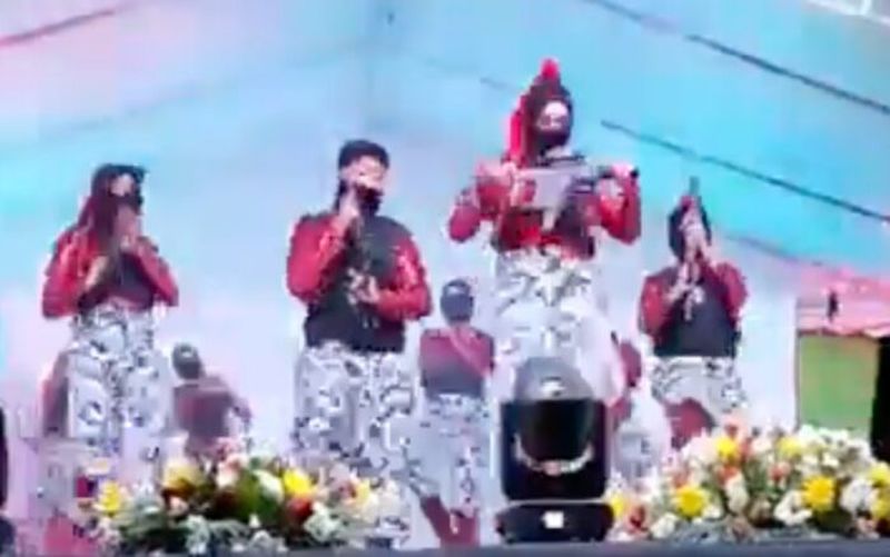 Estudiantes del Colegio de Bachilleres del Estado de Michoacán (Cobaem) bailaron con armas falsas, encapuchados y con las fotografías de alcaldes asesinados en el estado durante un evento escolar.