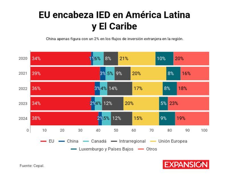 Durante 2024, la región captó 188,962 millones de dólares en inversión extranjera directa. De ese total, Estados Unidos aportó 38%, lo que confirmó su liderazgo como principal socio financiero. En contraste, China apenas representó 2% del total, según cifras de la Cepal.