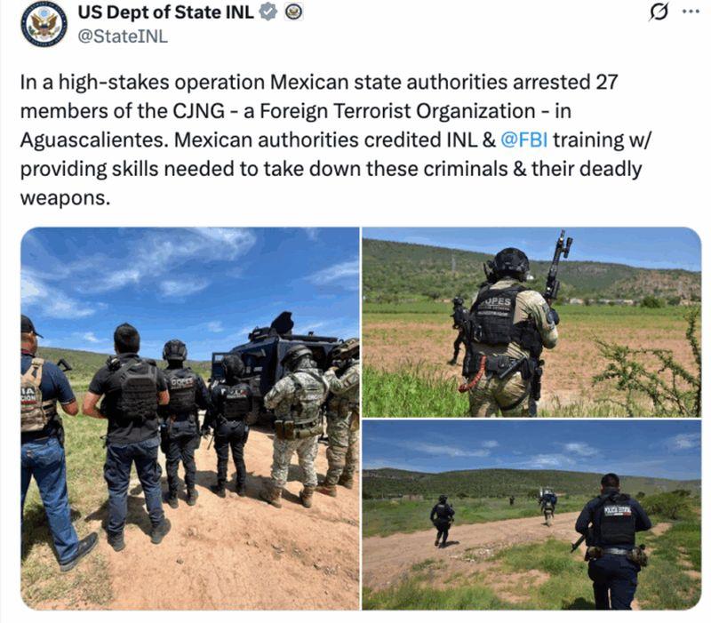 “En un operativo de alto riesgo, las autoridades estatales mexicanas arrestaron a 27 miembros del CJNG (Organización Terrorista Extranjera) en Aguascalientes. Las autoridades mexicanas atribuyeron al entrenamiento del INL y del FBI las habilidades necesarias para abatir a estos criminales y sus armas letales”, dijo la dependencia estadounidense.