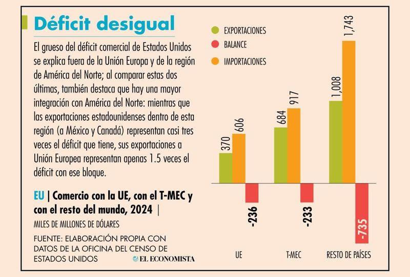 Su principal molestia es el déficit comercial de bienes de Estados Unidos con la UE, que en 2024 alcanzará los 236,000 millones de dólares, según datos de la Oficina del Censo de Estados Unidos. La UE señala que el superávit de Estados Unidos en servicios equilibra parcialmente la balanza.