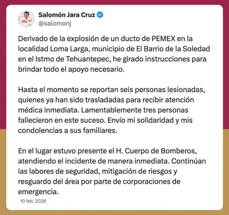 Tres personas fallecieron y seis más resultaron heridas tras una explosión e incendio de un ducto de Petróleos Mexicanos (Pemex), ubicado en Loma Larga, municipio de El Barrio de la Soledad, confirmó el gobernador del Estado de Oaxaca, Salomón Jara Cruz.