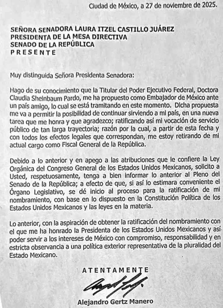 Hago de su conocimiento que la titular del Poder Ejecutivo federal, doctora Claudia Sheinbaum Pardo, me ha propuesto como embajador de México ante un país amigo, lo cual se está tramitando en este momento. Dicha propuesta me va a permitir la posibilidad de continuar sirviendo a mi país, en una nueva tarea que me honra y que agradezco; ratificando así mi vocación de servicio público de tan larga trayectoria; razón por la cual, a partir de esta fecha y con todos los efectos legales que correspondan, me estoy retirando de mi actual cargo como fiscal general de la República”, dice la misiva enviada por Gertz al Senado.