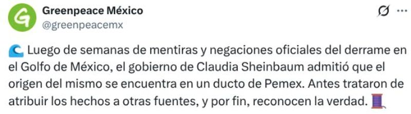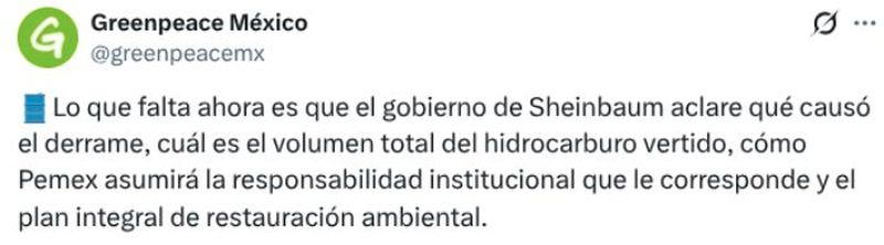 En ese sentido, Greenpeace exigió que el gobierno federal y Pemex informen de manera pública el volumen total del derrame, los costos de atención y remediación, así como el plan de restauración ambiental con metas y tiempos definidos.