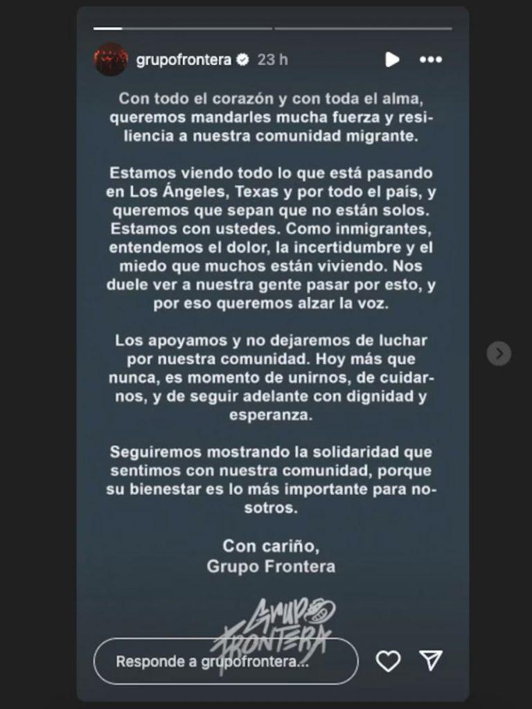 A través de un comunicado compartido en sus plataformas digitales, Grupo Frontera manifestó su solidaridad y preocupación por la difícil situación que atraviesan miles de familias migrantes en Estados Unidos.
