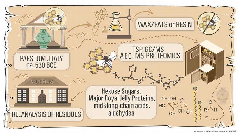 Ahora, y gracias a modernas técnicas analíticas, los investigadores sí han descubierto que ese residuo antiguo tenía una huella química casi idéntica a la de la cera de abejas y la miel modernas, que la composición química del residuo era más compleja que la de la cera de abejas degradada por el calor, lo que sugiere la presencia de miel u otras sustancias, y que el residuo contenía proteínas de jalea real, que son secretadas por la abeja occidental.