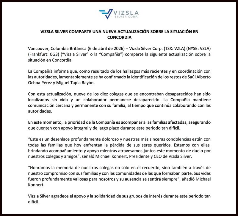 “Este es un desenlace profundamente doloroso y nuestras más sinceras condolencias están con todas las familias que hoy enfrentan la pérdida de sus seres queridos. Estamos con ellas, brindando acompañamiento y apoyo mientras atravesamos juntos este momento de duelo por nuestros colegas y amigos”, señaló en el comunicado Michael Konnert, presidente y director ejecutivo de Vizsla Silver.