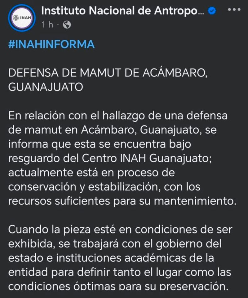 El Instituto Nacional de Antropología e Historia (INAH) informó que el colmillo, o defensa, de un mamut localizado en Acámbaro, Guanajuato, se encuentra bajo resguardo institucional y en proceso de conservación, luego de reclamos ciudadanos que exigen su regreso al municipio.