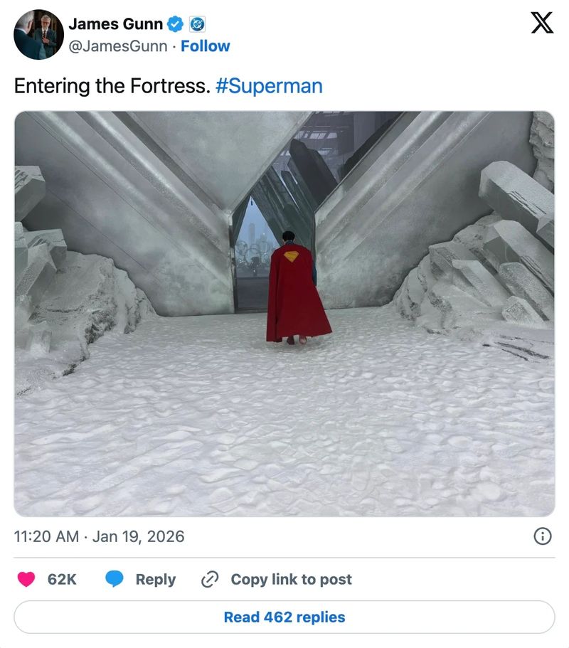 A medida que crece la emoción por Man of Tomorrow, el cineasta James Gunn ha compartido hoy un nuevo vistazo al superhéroe kryptoniano de David Corenswet entrando en la Fortaleza de la Soledad a través de su X. Se trata de un set práctico masivo e innegablemente impresionante. Apostaríamos a que es uno que se usará de nuevo en Man of Tomorrow y más allá, y Gunn confirmó recientemente que todavía está trabajando en los guiones gráficos (storyboards) para la próxima película.