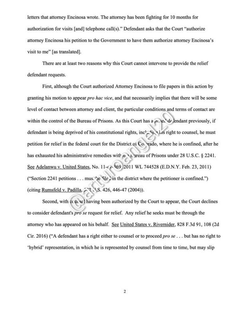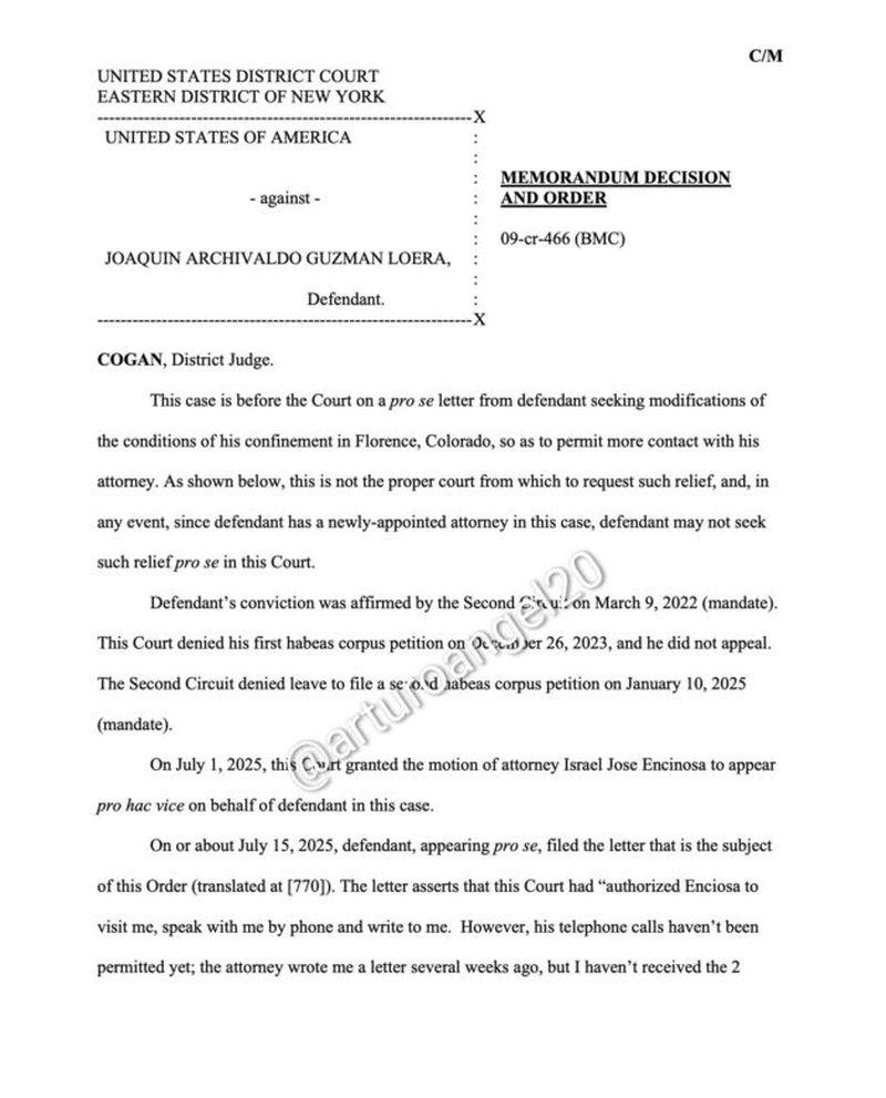 Juez Brian Cogan responde al ‘Chapo’ que no puede atender su solicitud para ver a su abogado