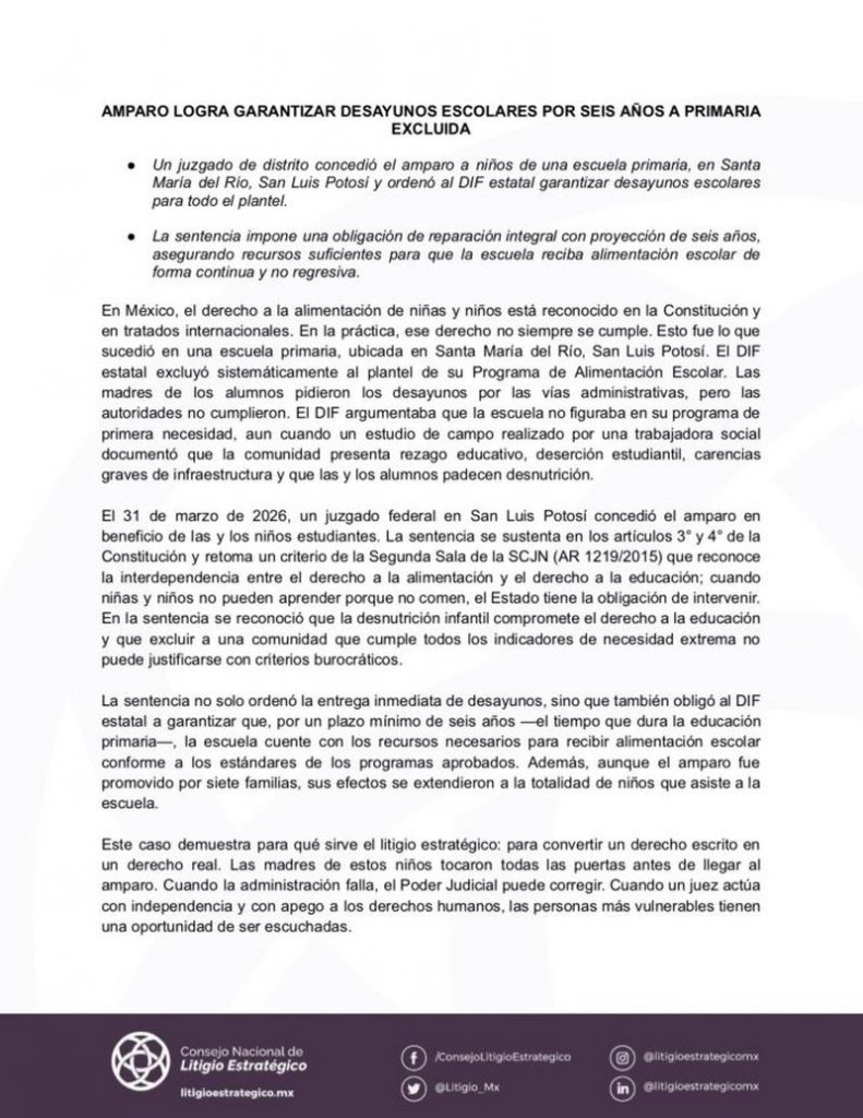 Un juzgado de distrito federal concedió un amparo que obliga al Sistema Estatal para el Desarrollo Integral de la Familia (DIF) a proporcionar desayunos escolares a todos los alumnos de una escuela primaria ubicada en el municipio de Santa María del Río. La resolución, dictada el 31 de marzo de 2026, asegura la alimentación continua y no regresiva de los menores por un periodo mínimo de seis años.
