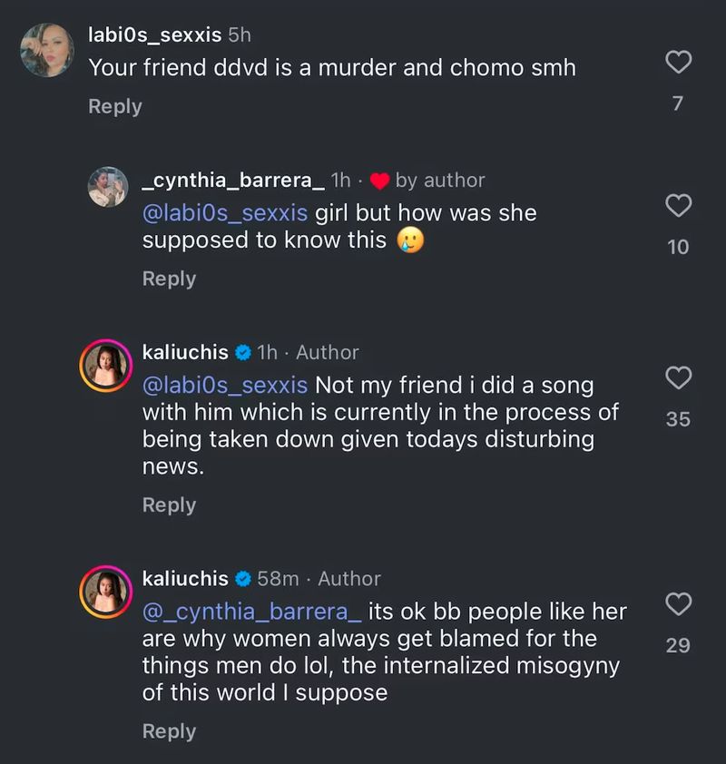 “Está bien, bb, gente como esta es la razón por la que siempre se culpa a las mujeres por lo que hacen los hombres, lol. La misoginia internalizada de este mundo, supongo”, contestó, subrayando el ambiente hostil que muchas mujeres enfrentan cuando se les asocia con figuras envueltas en controversia.