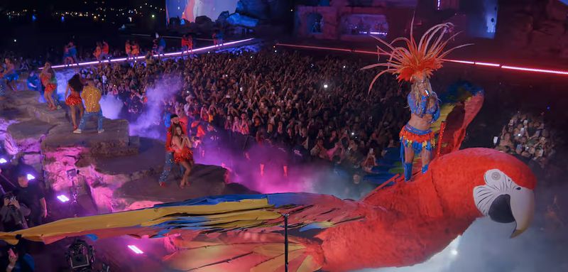 Lo urbano transmutó en tropical. La cueva siguió, llena de luces, pero las pieles y los bikinis dorados dieron paso a faldas de vuelo, camisas abiertas, abanicos y mucho color. La propia Karol G se colocó un espectacular tocado naranja de plumas sobre la cabeza, para cantar, cómo no, Tropicoqueta. “Qué rico verlos otra vez”, les decía a sus fans, emocionada. “Vinieron con unos looks hermosos, increíbles”, les alababa, en español, para preguntarles —por primera vez en inglés— cómo se encontraban. Y también, por primera vez y después de casi 600 días sin dar conciertos, cantó Papasito en directo, también mezclando español e inglés y subiéndose a un guacamayo gigante.