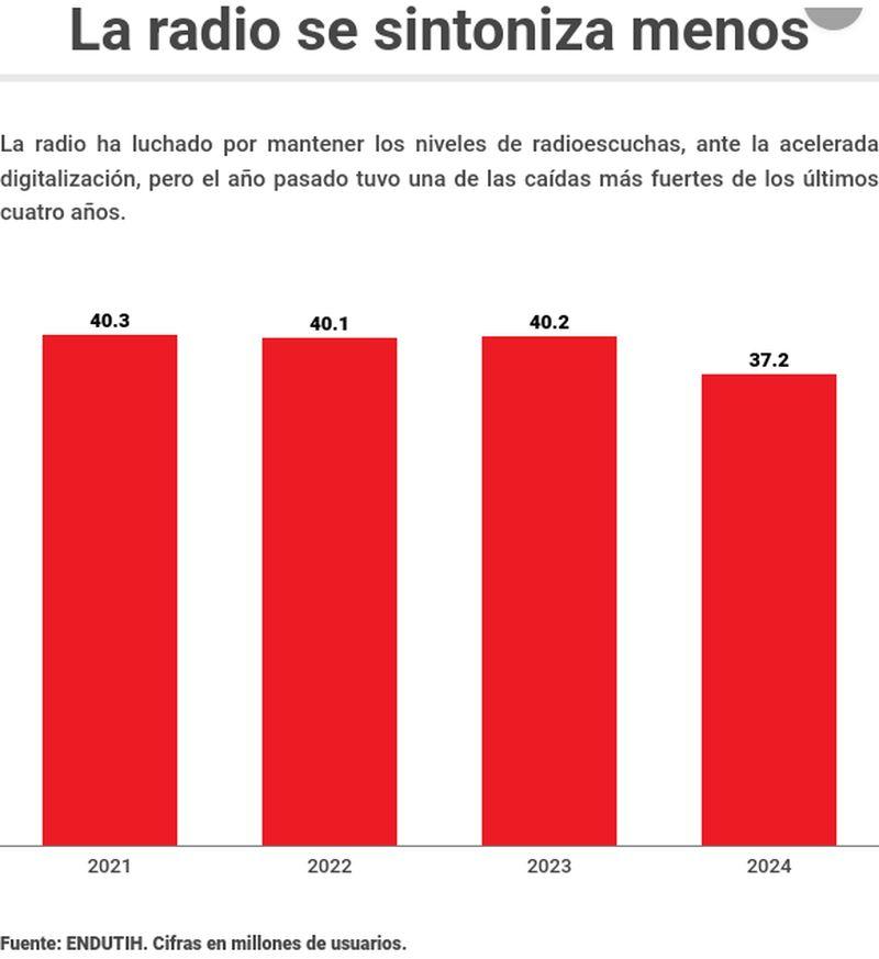 La Encuesta Nacional sobre Disponibilidad y Uso de Tecnologías de la Información en los Hogares (ENDUTIH) reportó que al cierre del año pasado, 37.2 millones de mexicanos aún son radioescuchas, pero esta cifra implicó una pérdida de 3 millones de usuarios, colocándose como la caída más profunda en los últimos años, cuando en 2021 totalizó 40.3 millones.