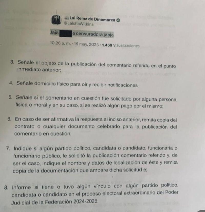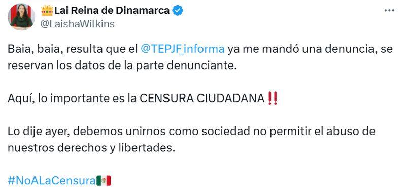 Y pues sí, Laisha Wilkins comparte que ya le llegó una denuncia de parte del Tribunal Electoral del Poder Judicial de la Federación.